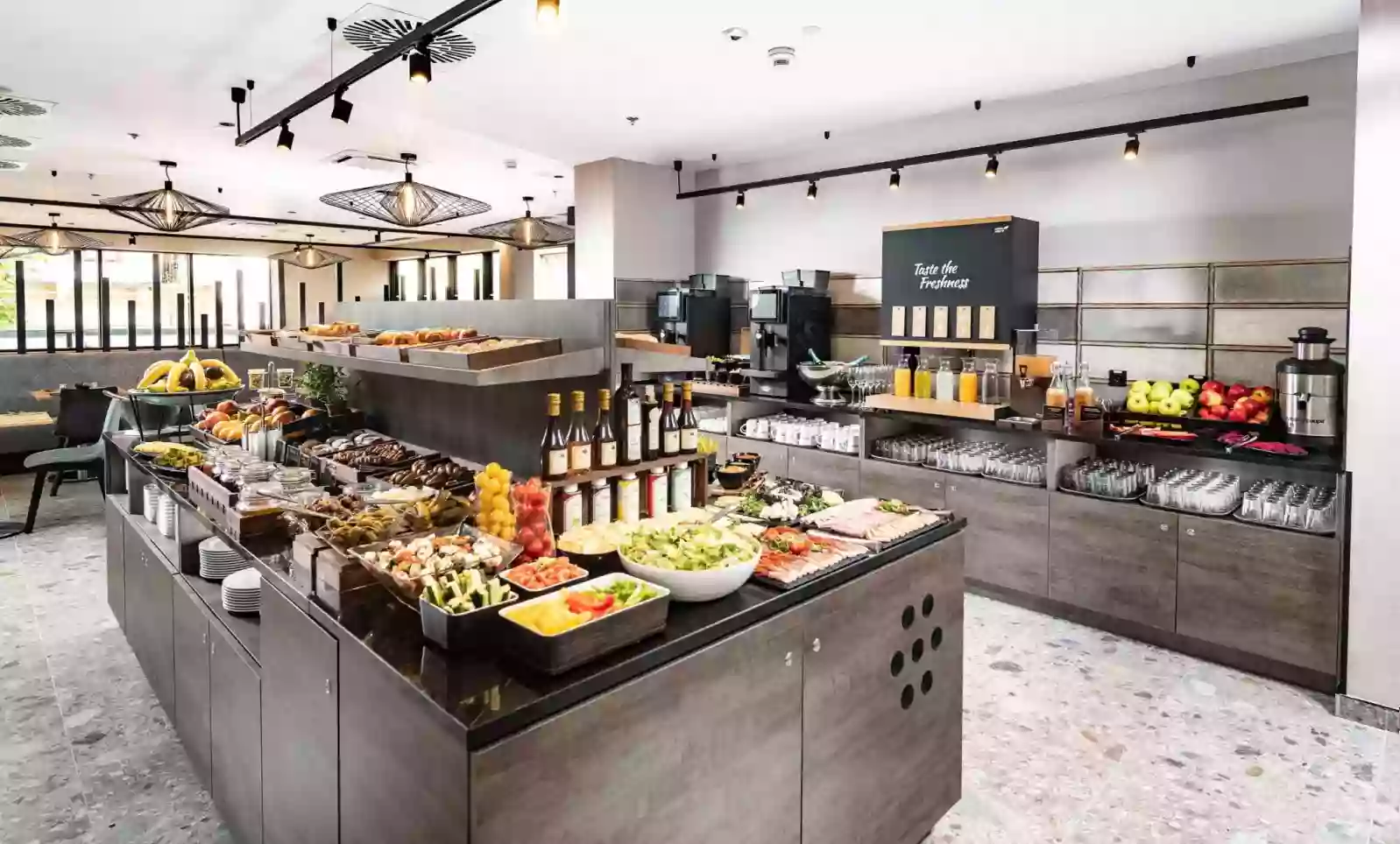 מסעדת המלון מציעה מזנון ארוחת בוקר בינלאומי באווירה של אור יום טבעי המשקיף על הטרסות המעוצבות והגינה הפנימית של הבניין.